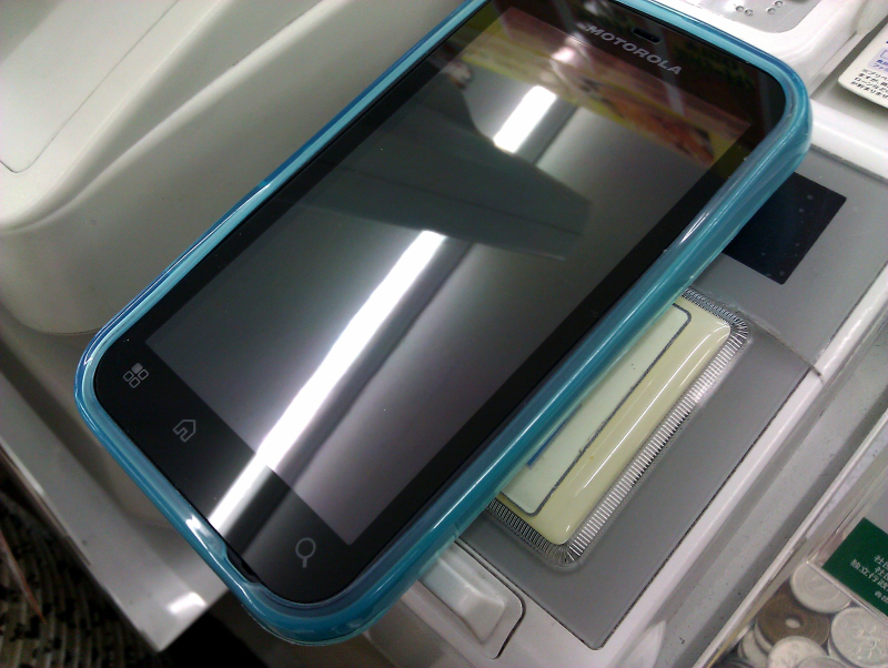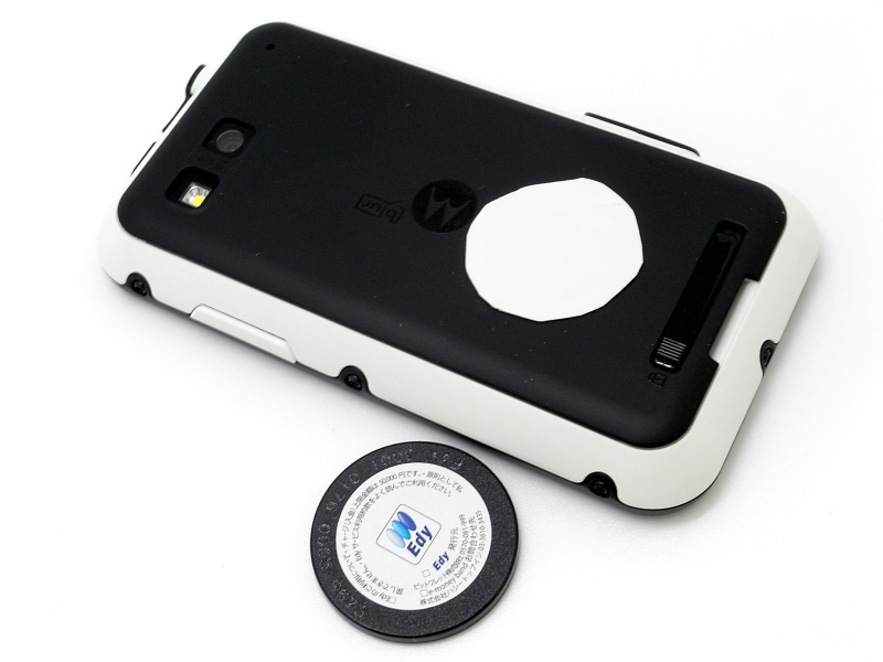 今回使用したのは、Motorola DEFY と TPUソフトケースの組合せですが、DEFYのバッテリカバーと Edy(エディ)の相性が悪く、そのままでは FeliCaポートで認識してくれませんでした。そこで、flux PIT Mobileを円形に切り取って、Edy(エディ)の裏に貼り付けて TPUケースを被せると、見事に認識できました。