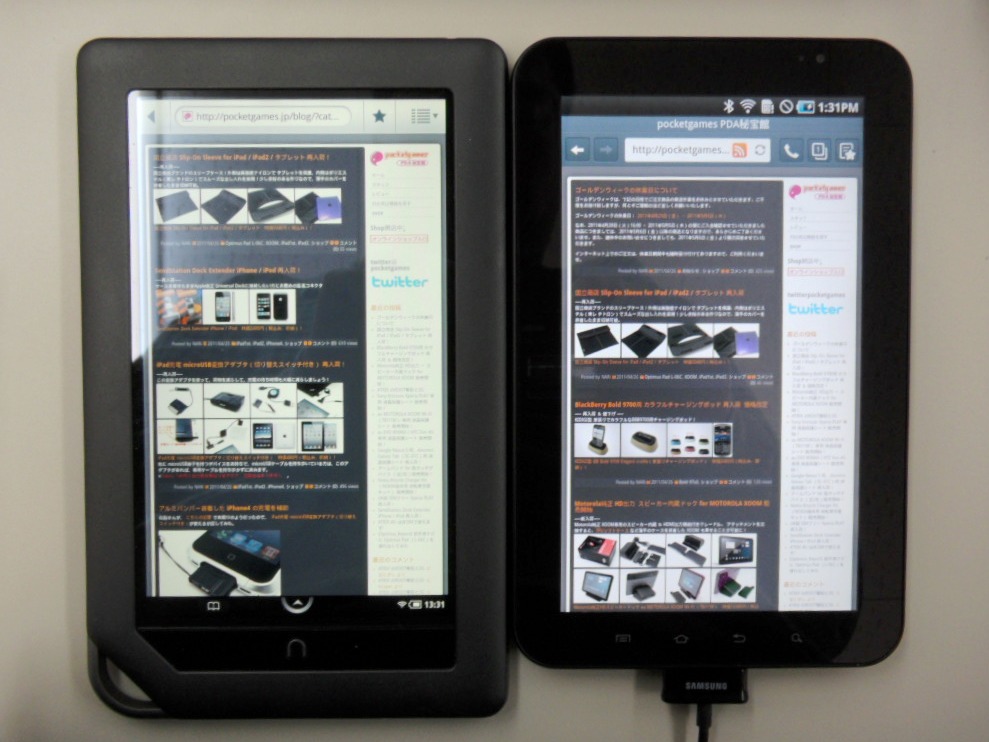 もちろんAndroidベースですし、ROMが出回ってたりして色々遊べるみたいですが、小心者の私は普通に使っておりました(ちょっとうずうずしておりますが)。NOOK Colorって、薄いのであまり感じませんが、実は440gもあってですね、メイン用途の寝落ち用(笑)には使えません。その重さだけで考えるとGalaxy Tabはより持ちやすく、390g!!と軽いんです。ま、NOOKは電池の持ちも良いですし、長時間の移動には良いデバイスなんですがね。薄いので書類などと一緒にカバンに放り込めますし。