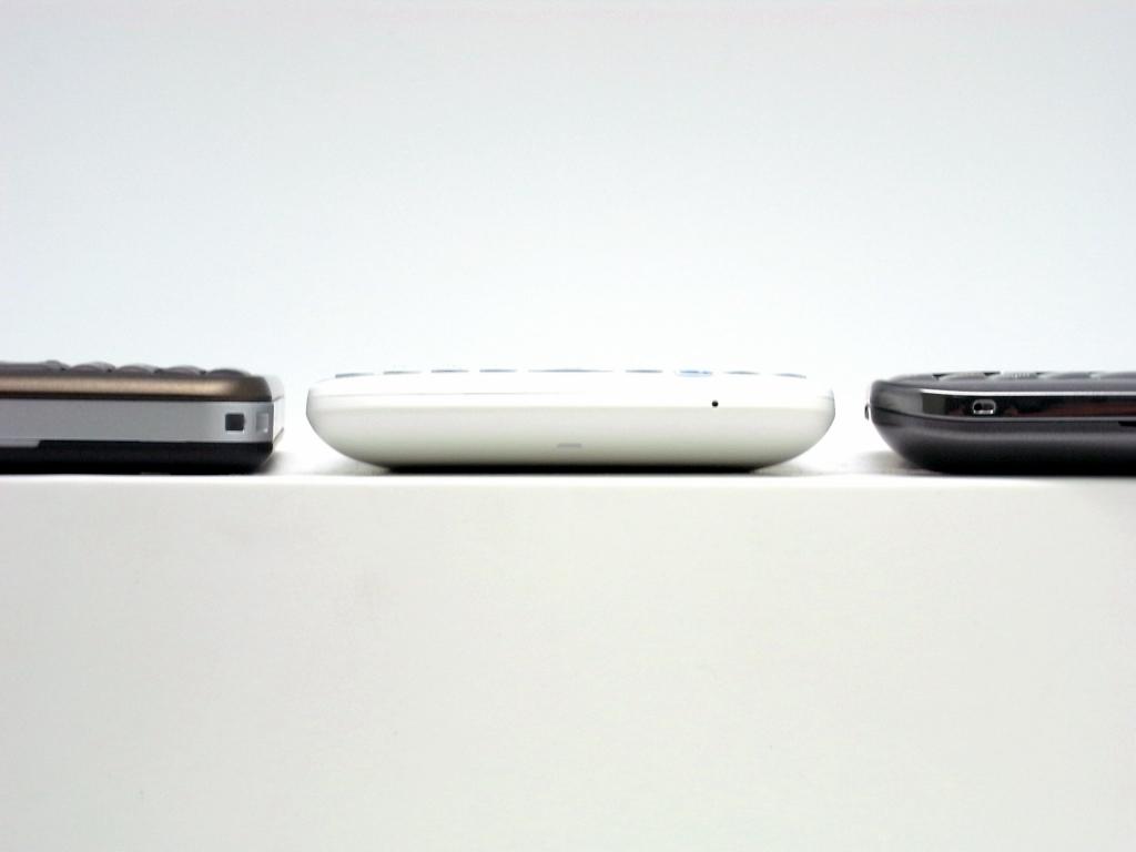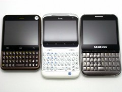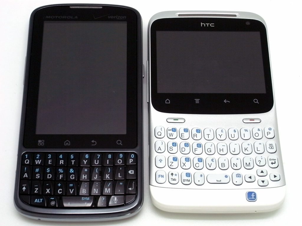 まずは、横長画面で、前面にQWERTYキーを装備する Motorola Cham(左)、ChaCha(中)、Samsung Galaxy Pro(右)の 3台。画面サイズは、ChaChaがひとまわり小さいですが、解像度が高いので、画面くっきり。また、3台とも、そこそこ幅のあるデバイスですが、全体にラウンドされている分、ChaChaが一番持ちやすいです。あと、ChaChaの良い点を3つ。一つ目は、QWERTYキーの下側の余白が適度にあることで最下段のキーも押しやすい。二つ目は、受話/終話キーがハードキーで付いているので基本的な電話操作がやりやすい。三つ目は、標準のブラウザアプリで気付いた点ですが、URLを入力したり、Bookmarksからあるページを開くと、目的のページが開き終わった時点で画面上の Notifcationバーが隠れることです。縦方向に短い画面のデメリットを少しでもカバーしているのが嬉しいです。URL入力欄にフォーカスがある間は、Notifcationバーも表示されるので、通知や時間が気になる場合は、URL欄を引き出してタップすればよいです。※追記(2011/06/21 20:14) 三つ目の良い点は、Sensationでも同じ動作だったので、最近のHTCブラウザに共通な動作みたいです。逆に、広い画面のSensationでは、常に Notifcationバーを表示しておきたいような気がします。
