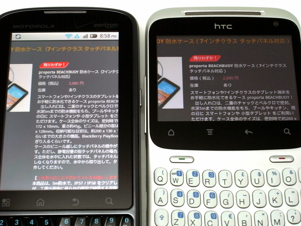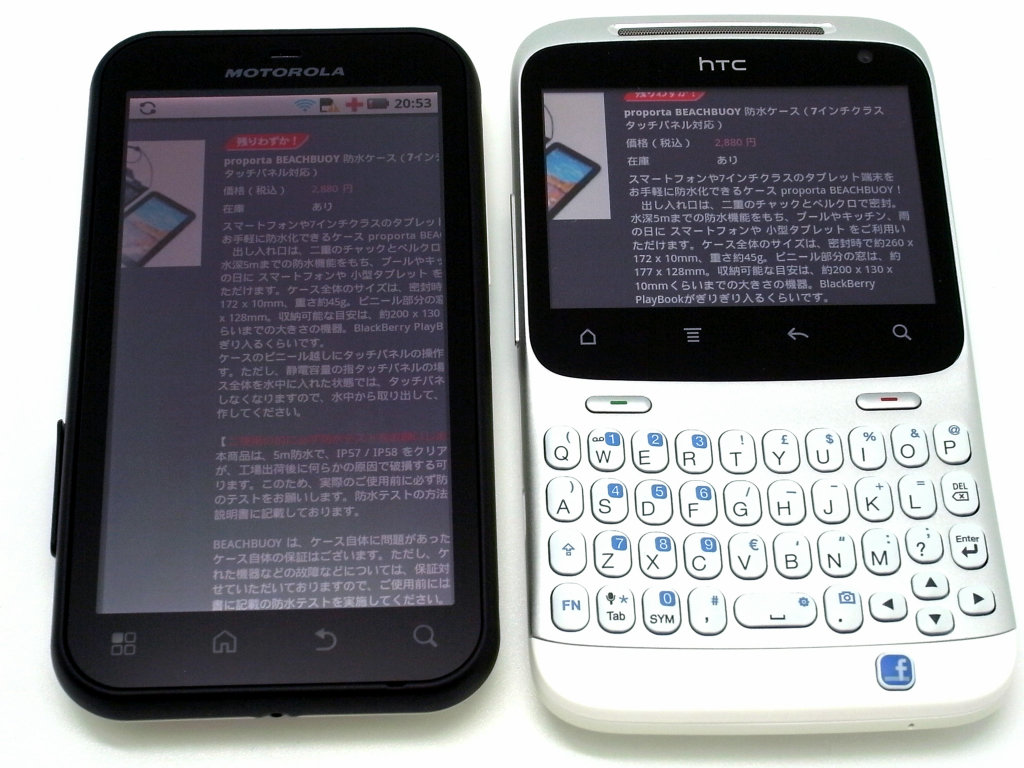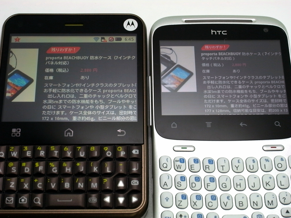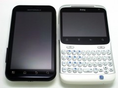 続いて、小型防水デバイスの Motorola DEFY(左)と ChaCha(右)の 2台。なぜ、この 2台かというと、画面とキーボード周り以外のスペックが似ていることから、小型デバイスで悩んでいる方の目安になればと思い、あえて比較してみました。まず、幅が狭く側面もラウンドしているので、DEFYの方がかなり持ちやすいです。そして、画面表示の一覧性も、当然 DEFYの方がよいです。なので、ハードキーにこだわらなければ、ChaChaを選ぶ理由はないと思います。逆に、ハードキーが好みだったり、root取って一部キーの役割を変更などカスタマイズの可能性を見出せれば、ChaChaはオススメ。