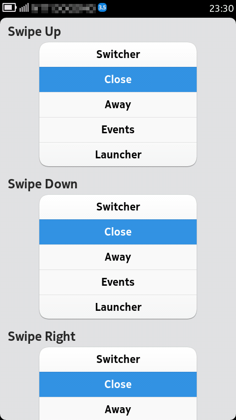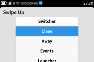 AndroidなどでTaskを殺すアプリを導入されている方も多いかと思いますが、Swipe Nanagerは親指一本で簡単に終了させることができるんです。Swipeの上下左右の方向それぞれに、Switcher、Close、Away、Events、Launcherの動作を指定でき、私の場合はそれぞれAway、Close、Launcher、Closeに設定しています。