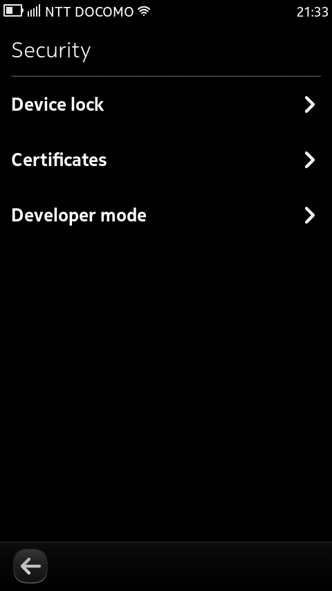 さて、N9を骨の髄までしゃぶってみたい方はデベロッパーモードに設定する必要があります。日本語の入力ツールやフォント入替には必須。さてその方法ですが、SettingsアイコンからSecurity → Developer mode → Developer modeのスイッチをタップします。