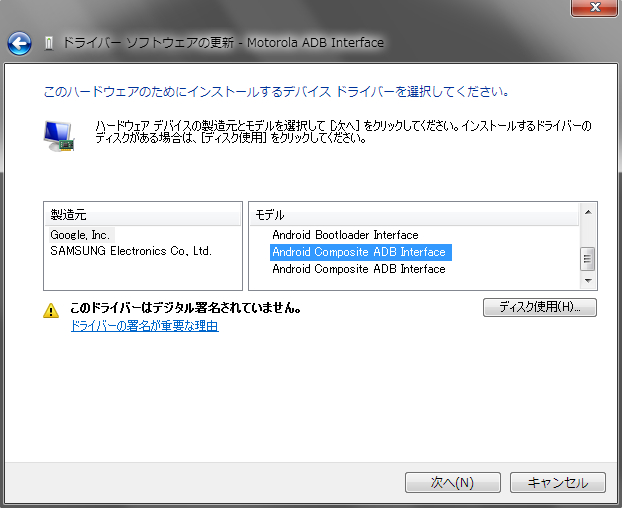 デバッグモードで MB632を PCと USB接続。すんなりドライバが認識されないので、手動で「Android Composite ADB Interface」を導入。