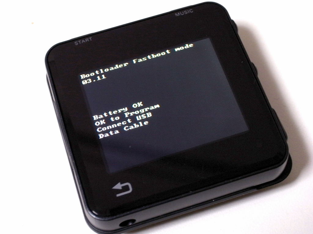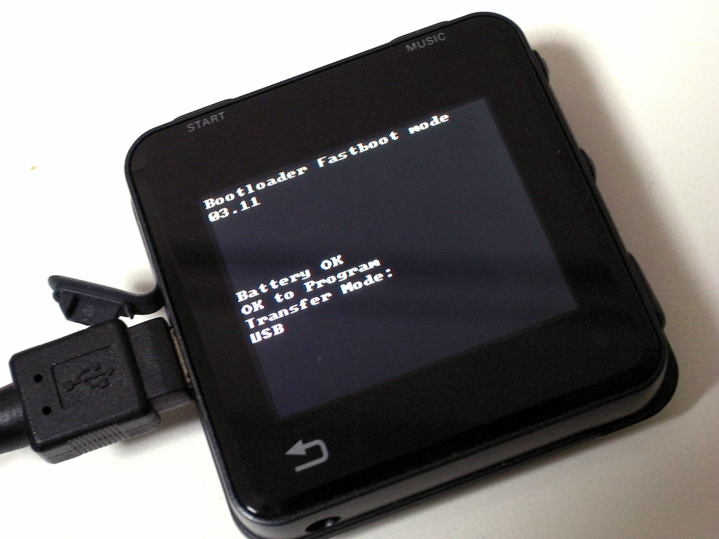 バージョンアップが終わったら、MOTOACTVの電源をOFF。それから、STARTキーと電源ボタンを3秒同時押しして離すと、Bootloader Fastboot modeになります。この状態で、PC とUSB接続。