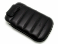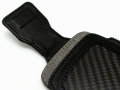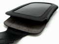 正面にカーボンファイバー素材をあしらった高級感あふれるポーチタイプのレザーケース。