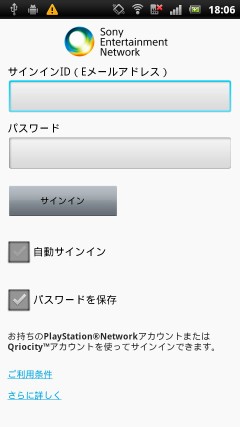 それでは、Xperia arc S で実際に使ってみます。アプリを起動して、登録した IDとパスワードでログインします。