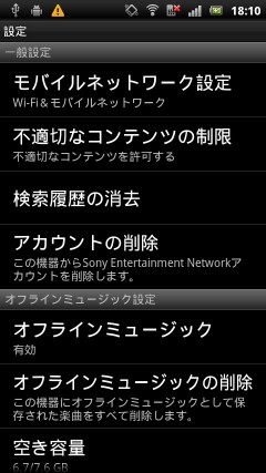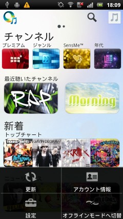 MENUボタンを押すと、更新、アカウント情報、設定、オフラインモードへ切替、というメニューが表示されます。オフラインモードを使うには、あらかじめコンテンツをプレイリストに登録しておく必要があり、設定で「オフラインミュージック」を「有効」にしておきます。