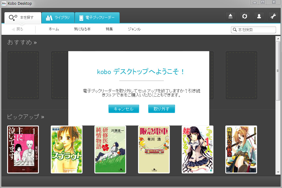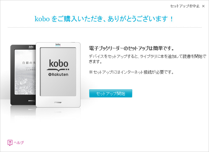 パソコンに接続すると、今度は、rakuten.kobosetup.comにアクセスして、専用のアプリをインストールしないといけません。自動でサイトが開くようなこともなく、URLは手打ちしましたが、他に方法はないのかな。