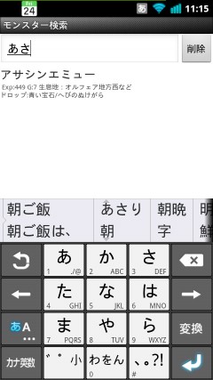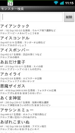 モンスターの検索では、こんな感じでHP、経験値、ゴールド、主な生息地、ドロップするアイテムが表示されます。さきほども書きましたが、モンスターとアイテムの検索は、インクリメンタルサーチに対応しているので、候補がどんどん絞り込まれていきます。