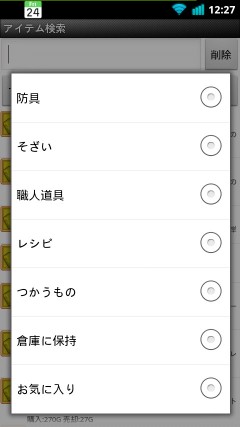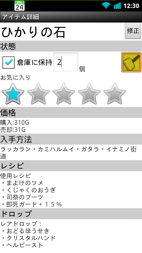 各アイテムごとに、こんな感じでチェックを入れておけば、自分が何を持っているか、すぐに一覧表示することができます。 なお、現バージョンでは、右上の「修正」ボタンは機能しないようです。