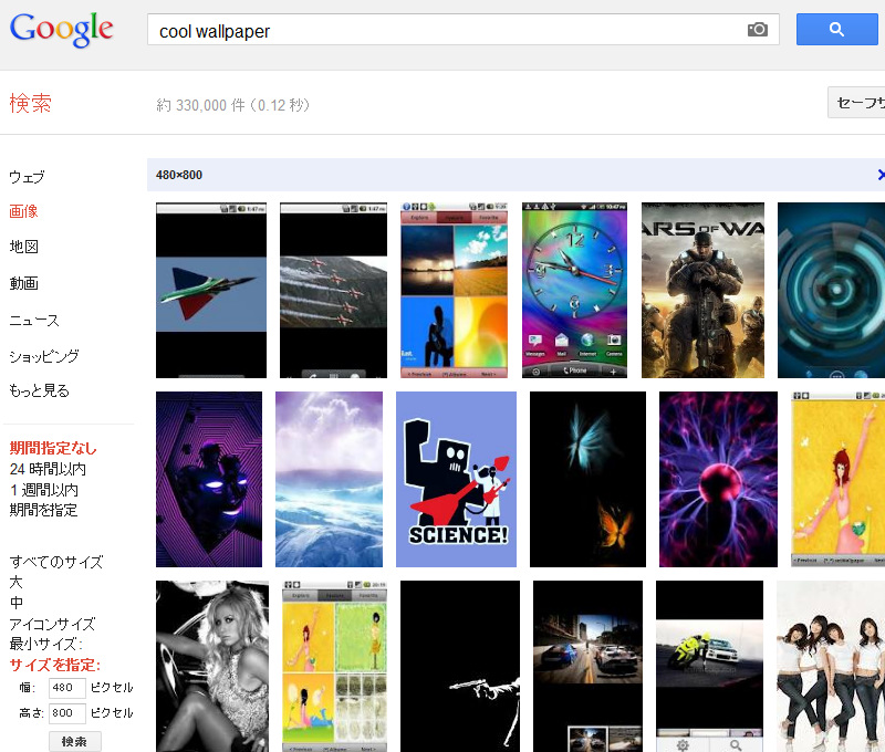 こちらが「cool wallpaper」をキーワードに、幅480、高さ800の画像を検索してみた結果です。