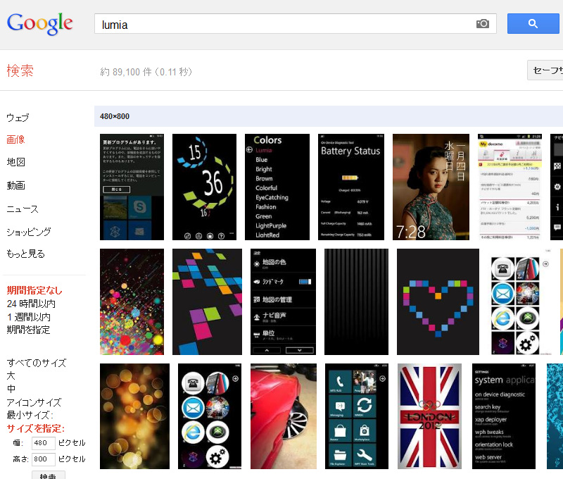 こちらは、キーワードを「lumia」、幅480、高さ800の画像を検索してみた結果です。なかなか良さげな画像がヒットしてますね。