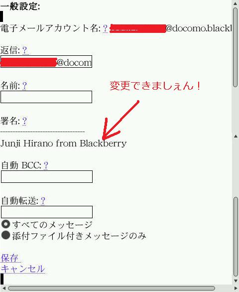 Gmailアプリ経由で返信すれば会社のアドレスで返信できるのですが、メーラーからついつい返信してしまうとxxx@docomo.blackberry.com が使われてしまうのは困りますよね。また、デフォではBlackBerry from DOCOMOなーんて署名が入っていますから、取引先に「何これ?」って指摘されてしまいました。