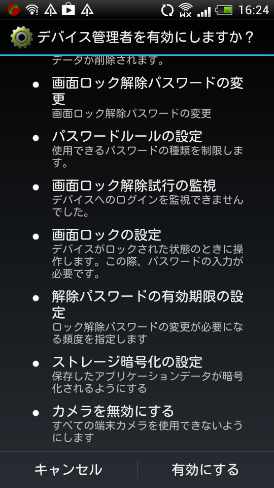 データ削除、画面ロックパスワードの変更、パスワードルールの変更、画面ロック解除試行の監視、画面ロックの設定、解除パスワードの有効期限の設定、ストレージ暗号化、カメラの無効などができるようです。もちろん、Android側のOSバージョンによりできることできないことがあると思います。