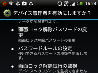 AndroidにDevice Policyというアプリを入れると、リモートワイプや、グループ利用の連絡先を使えたり、ポリシーの変更だったりと管理者からコントロールができるようになるらしい。