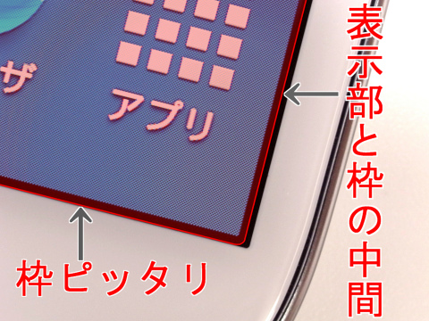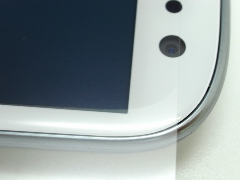 Galaxy S III は、スクリーン面の縁がわずかに曲がっているため、表示部分のみの保護となっています。とくに四隅付近の曲がりが大きく、縦方向よりもサイドの淵の方がシビアなスクリーンとなってます。