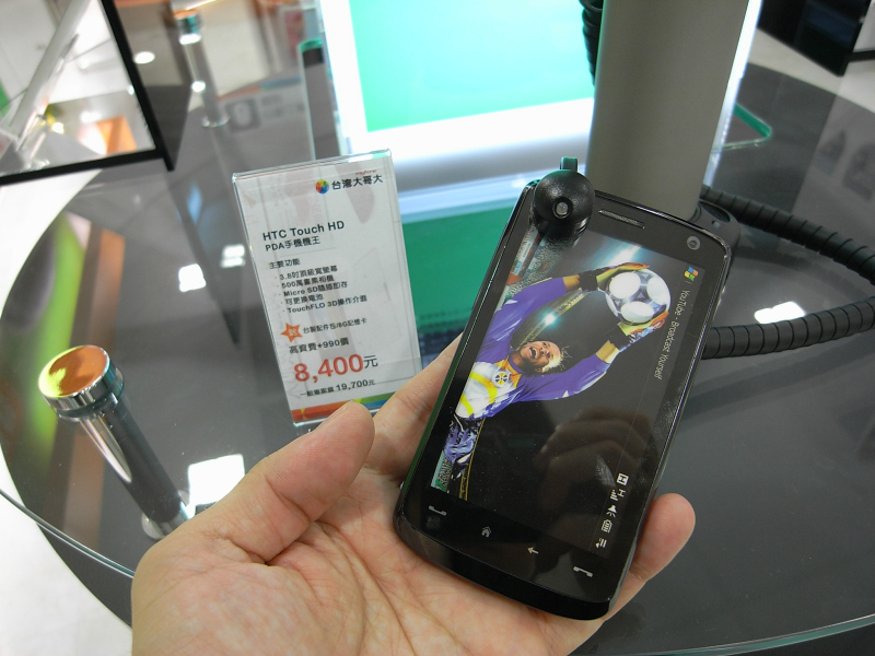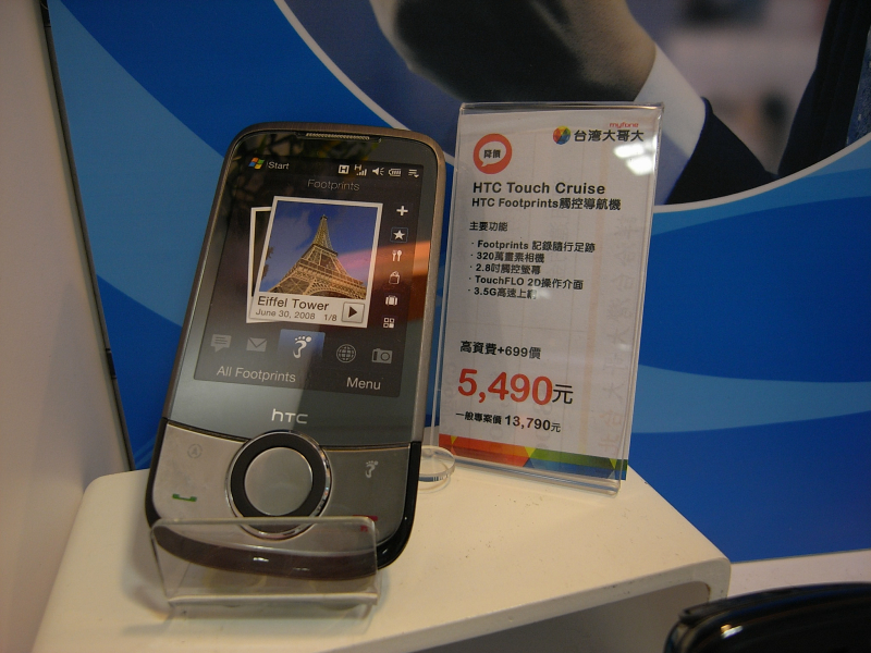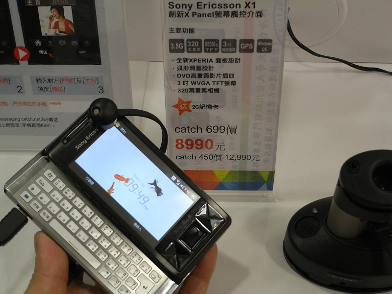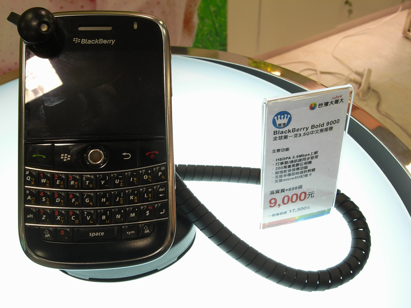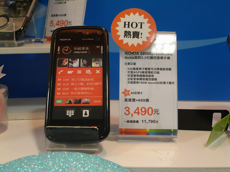 Taiwan Mobileのショップにて、スマホがごろごろ。台湾の部首?入力記号入りのBBB、5800XM、Touch HD、Cruise2009、X1など。契約込みのお値段なんで安く感じてしまう。