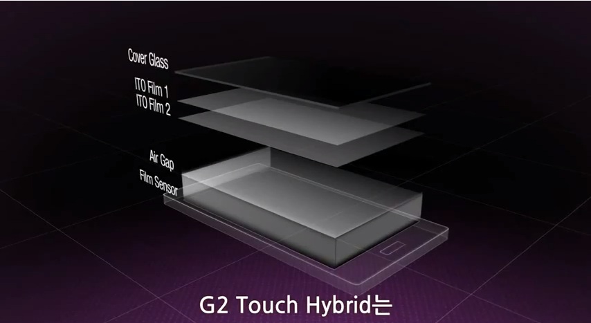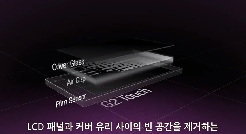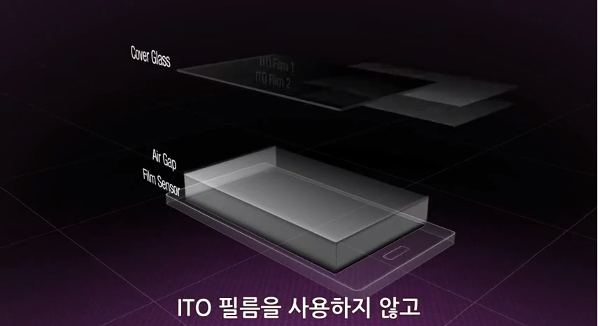 こちらが従来のディスプレーです。ガラスの次にはITO Filmと呼ばれるフィルムが2枚、空気層がどかーんと大きな空間を占めています。