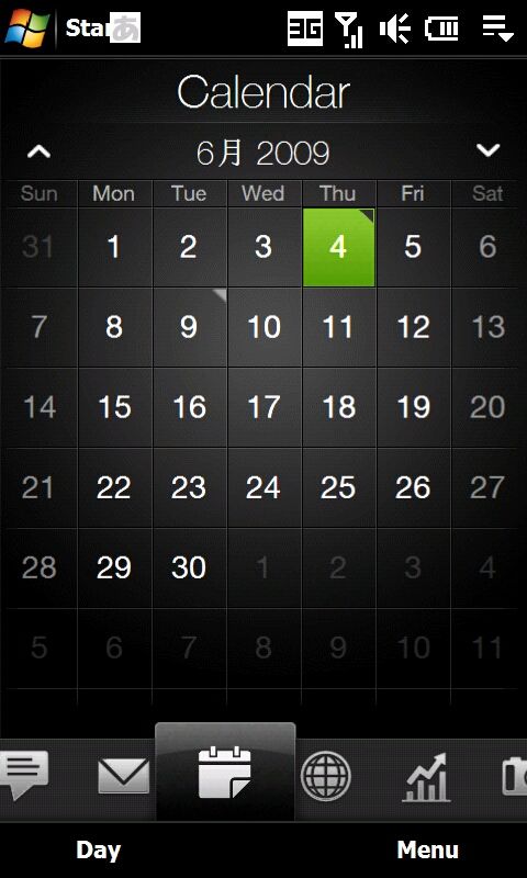 Calendarは月間の予定表が表示できる。予定のある日はマスの右斜め上の色が変わる。日をタップするとその日の予定が表示される。また、カレンダーは上下になぞることにより、月を簡単に切り替えることも出来る。