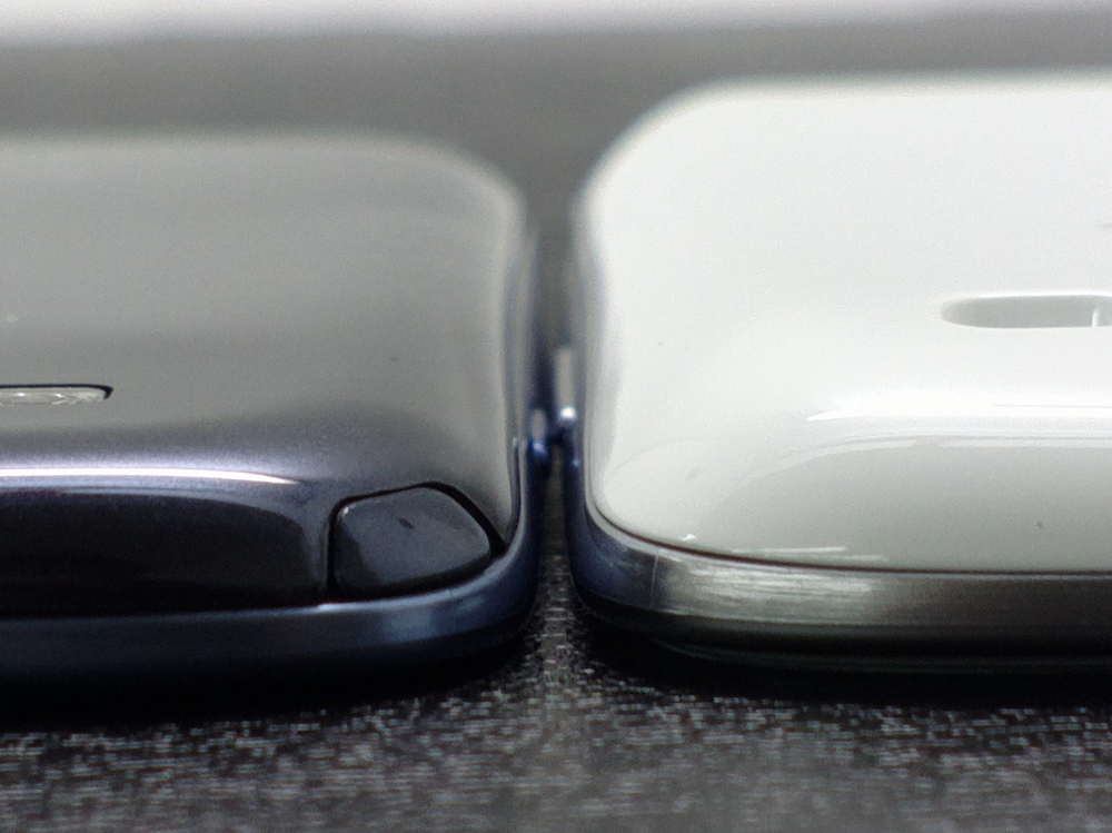 厚さ比較です。左はGalaxy S IIIαです。ご存知の通り、アンテナ以外にも爪の位置が違うため、ドコモローカル版にはお使いいただけません。