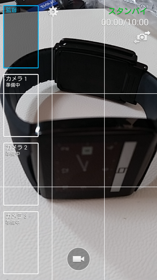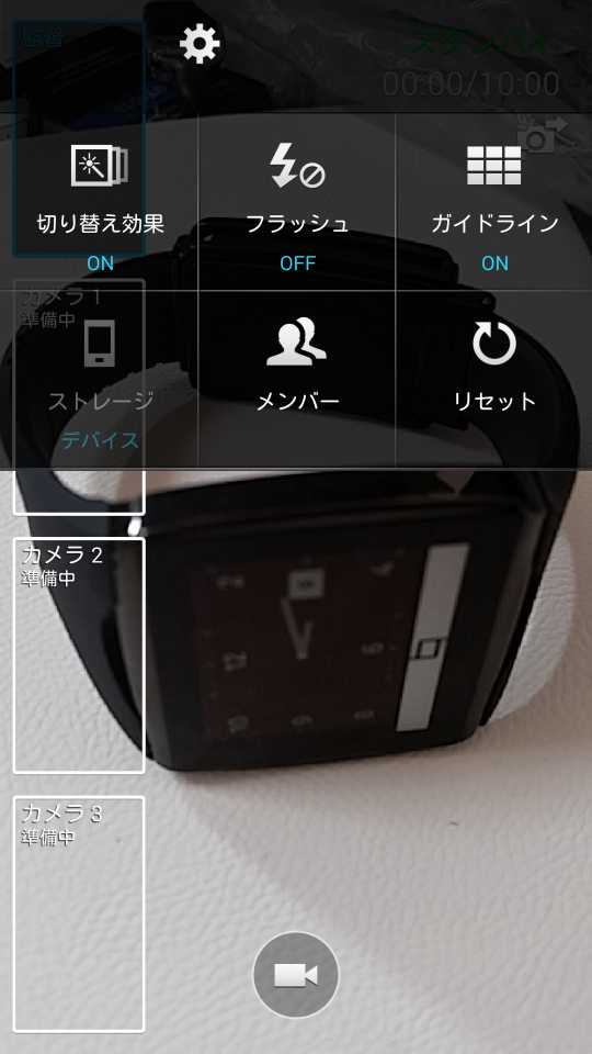 通常の撮影画面以外に左にカメラが4個並びます。一番上はディレクターのカメラ。その下は、グループ内にいるカメラで、ディレクターはそのカメラに撮影中でも切り替えることができる(のでしょう)。