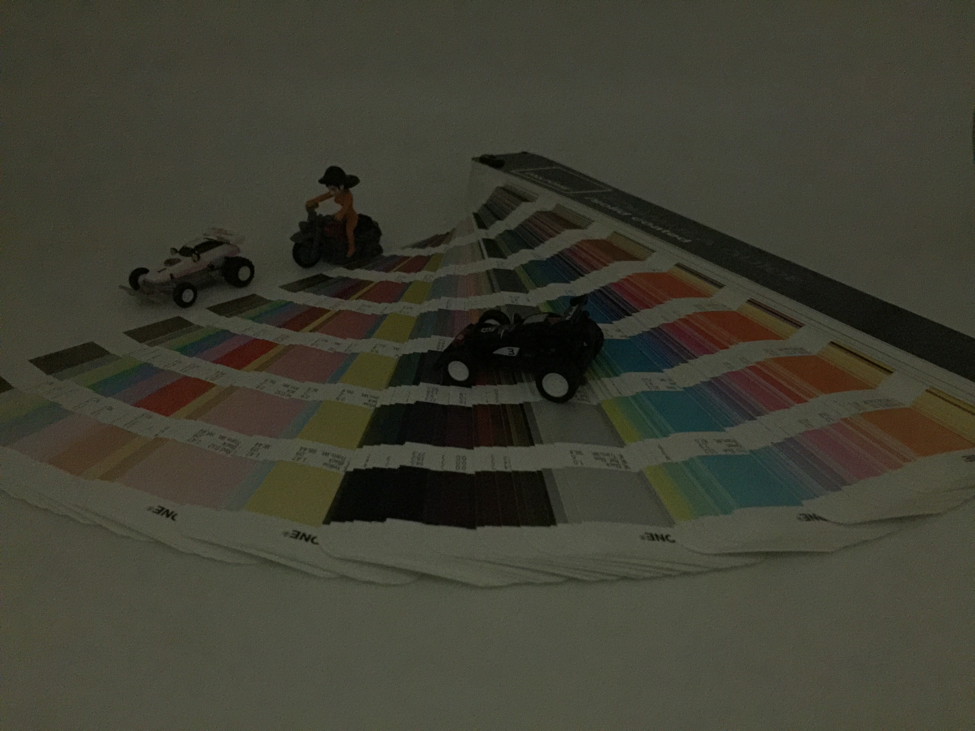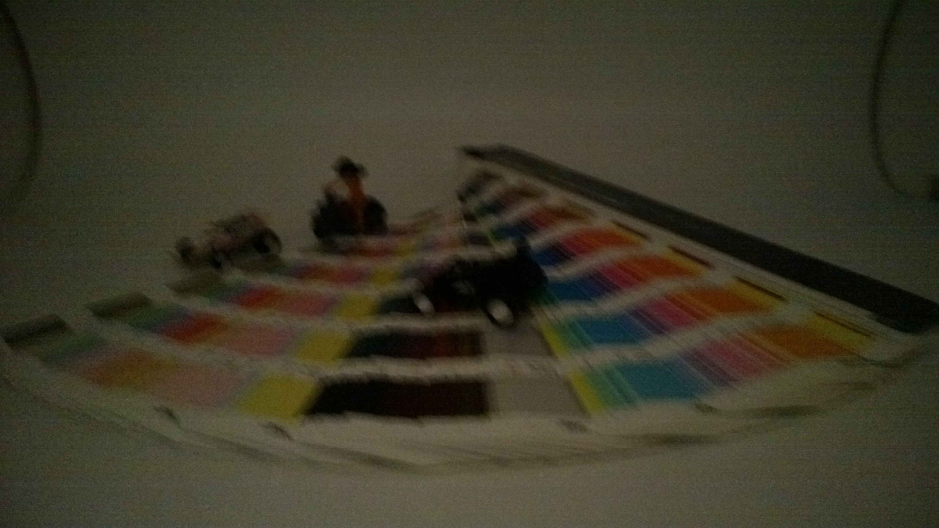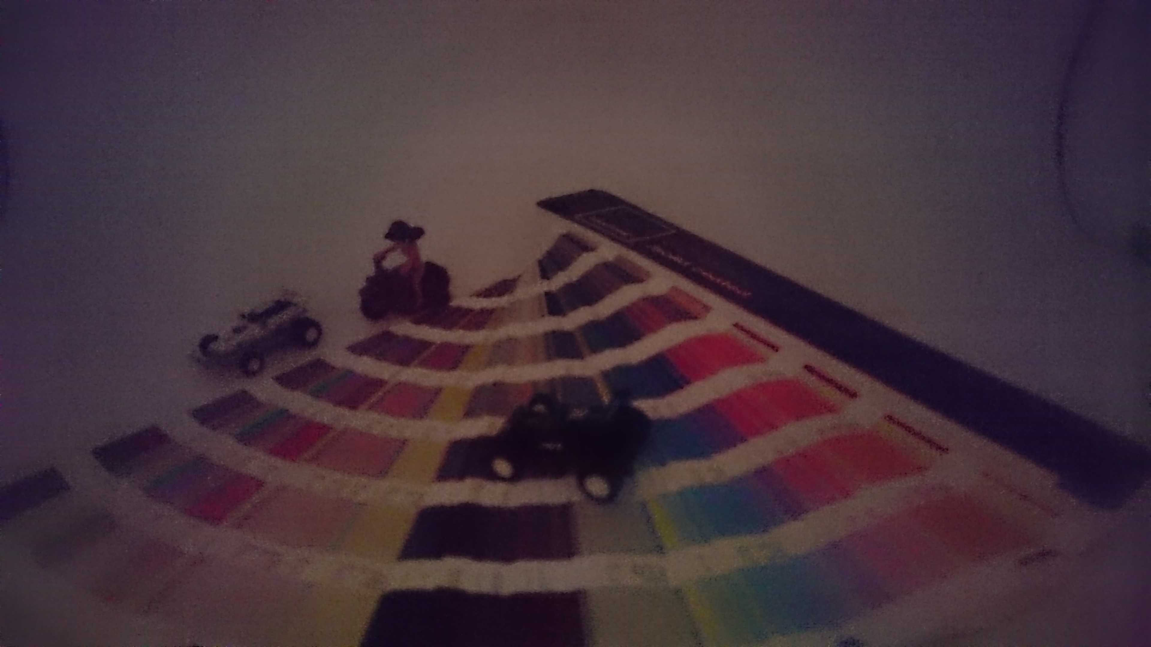 8台とも不合格、5台は論外だったので、ほんの少しだけ明るくしてみた。と言っても、遠くの部屋の明かりを点灯させただけなので、壁や天井に反射して光がほんの少しだけ入ってくるレベルです。クリックすると元の画像が表示されますので、例えばパントーンの数字が見えるか、中央の車のホイールのボルト穴などに注目してください。