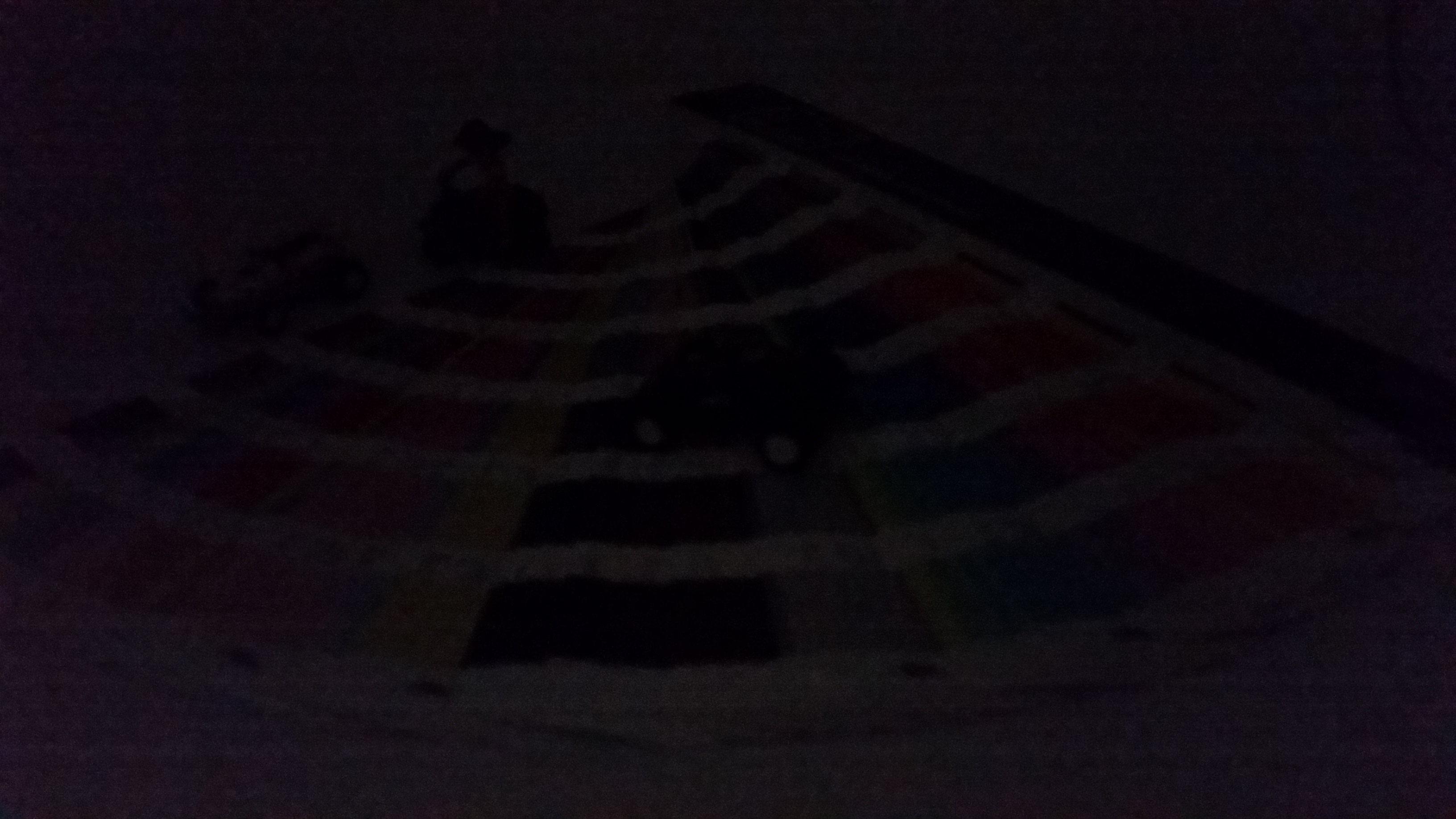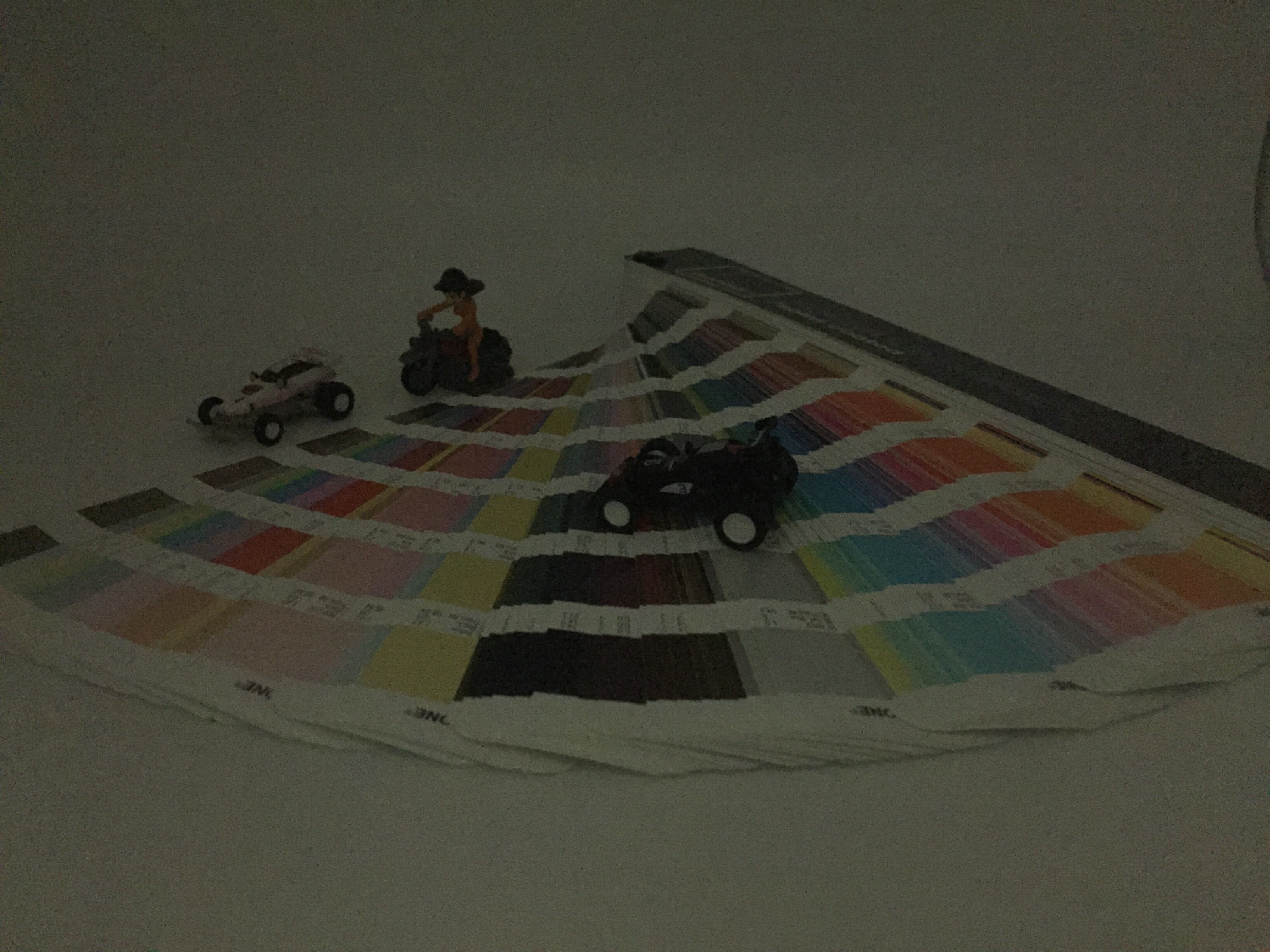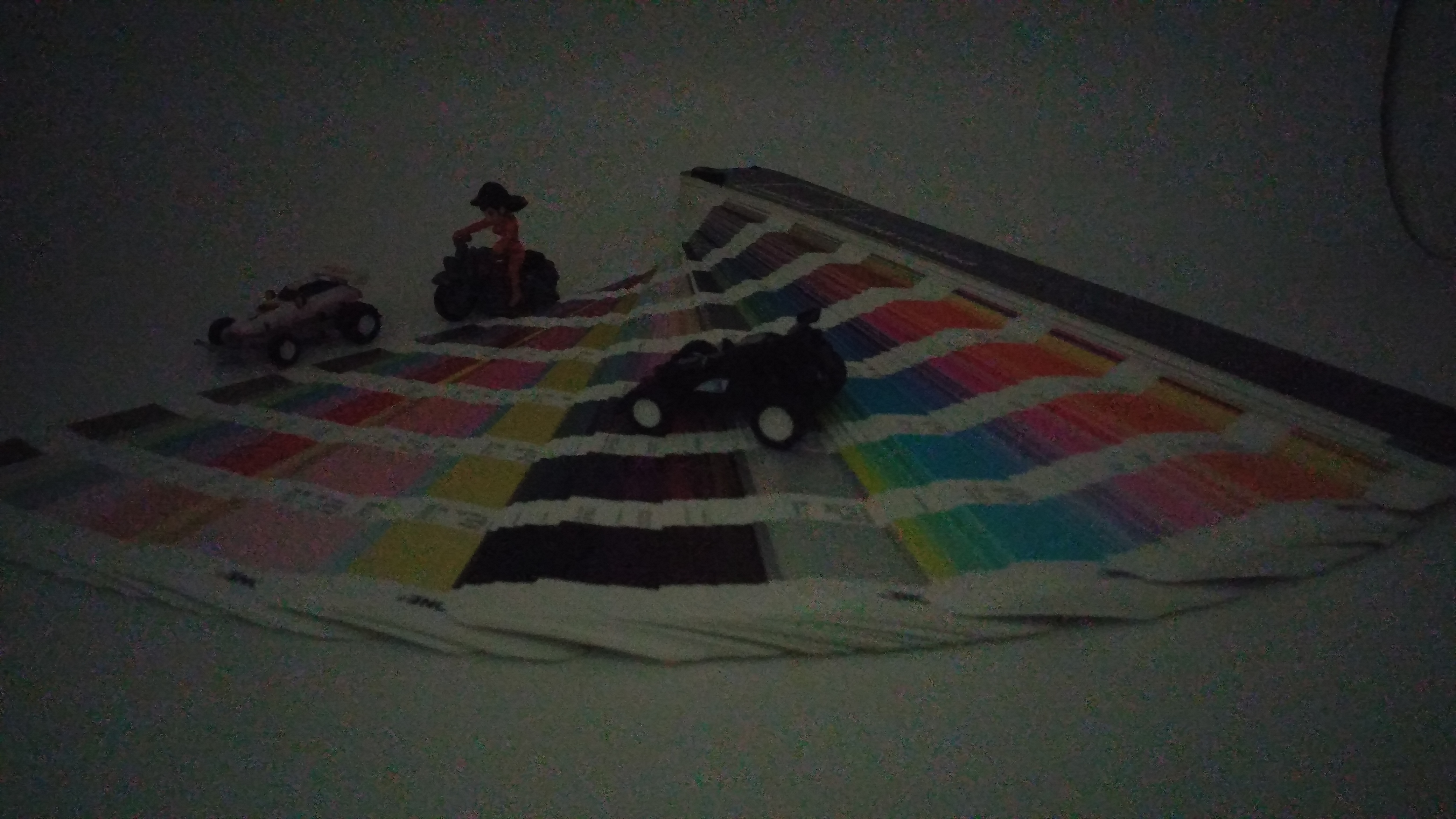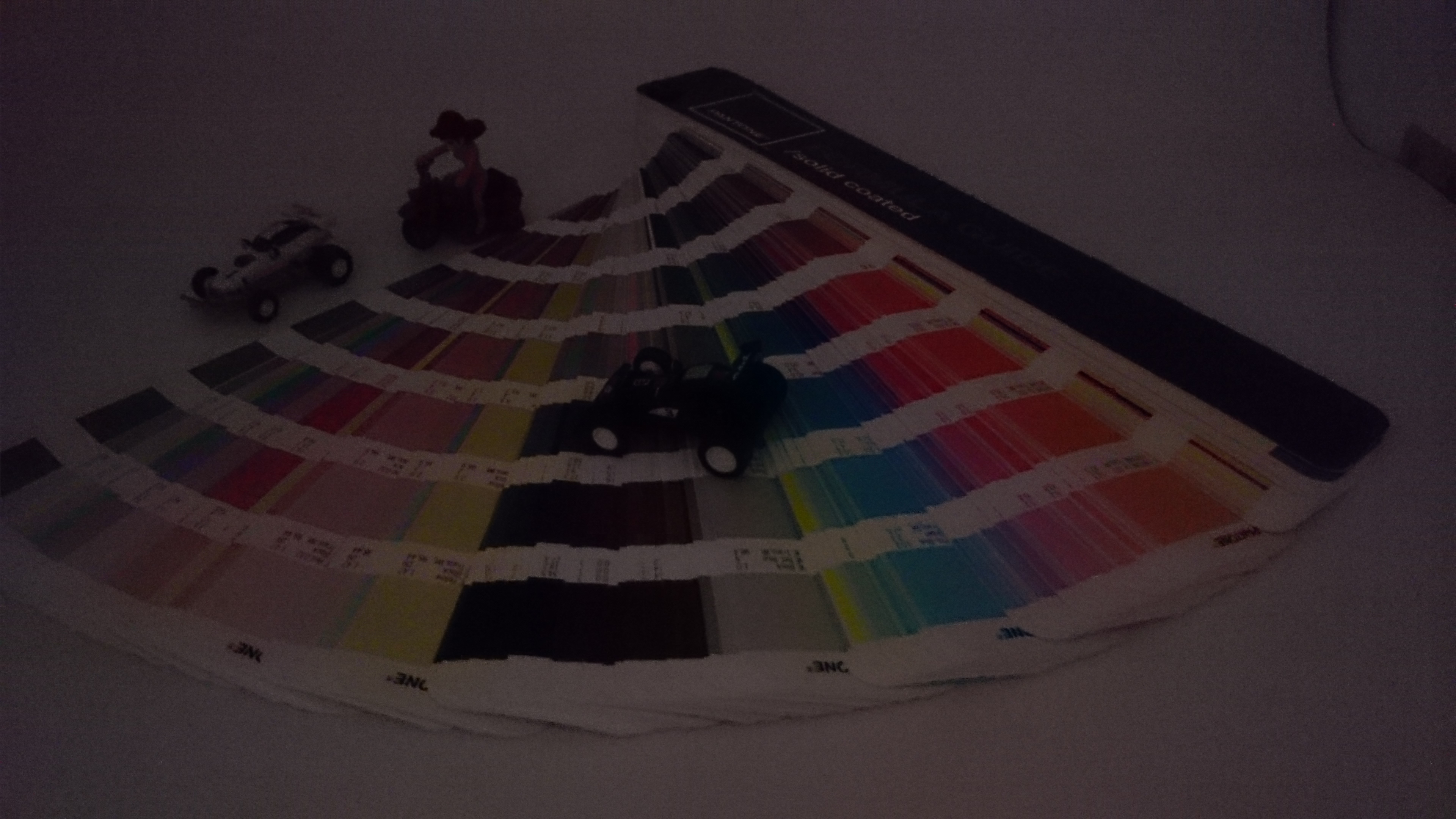 8台とも不合格、5台は論外だったので、ほんの少しだけ明るくしてみた。と言っても、遠くの部屋の明かりを点灯させただけなので、壁や天井に反射して光がほんの少しだけ入ってくるレベルです。クリックすると元の画像が表示されますので、例えばパントーンの数字が見えるか、中央の車のホイールのボルト穴などに注目してください。