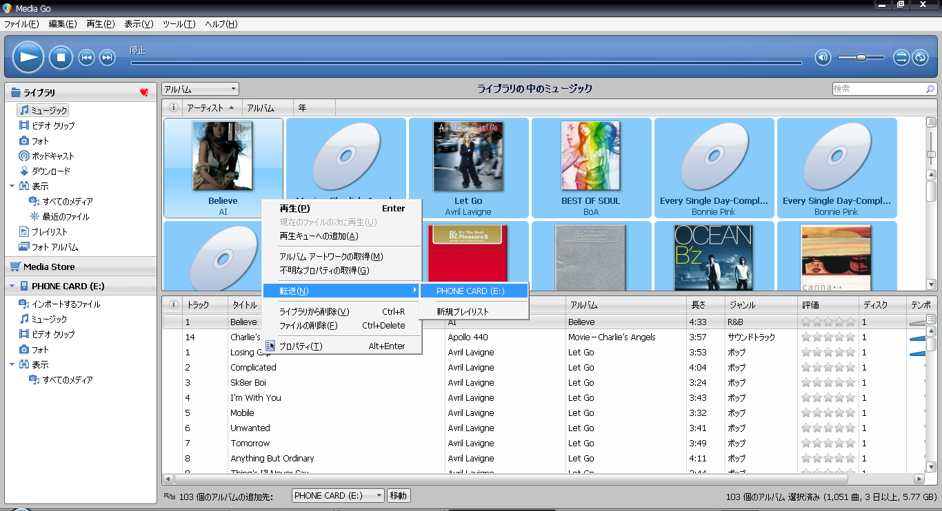 PCからXperiaへの音楽転送は、転送したい楽曲なりアルバムを選択して、右クリック > [転送] > [PHONE CARD]を選択です。ちなみに1051曲(5.77GB)を転送するのに1時間52分かかりました。