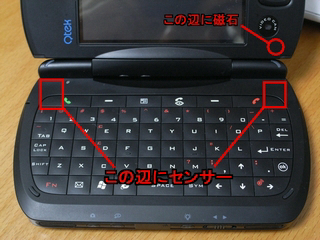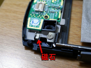 液晶画面向かって右下に磁石がありました。磁石とセンサーが近づくと、特定の動作をするようになっているようです。