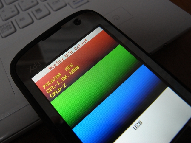 アンロックの途中、Orbit2側に許可を求めるポップアップがたまに出てくるので「Yes」をタップしてアンロックを進行する。Step1のアップデートROMのインジケーターがPCの画面に出てきて、Orbit2の画面が赤緑青の画面になった時、画面上部に「Replug USB Cable!」と表示されるので、いったんUSBケーブルを抜いて挿し直す必要がある。
