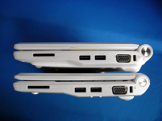 サイズ的には奥行きが少しアップした程度で、よく見ないと違いに気付かないかも。4GB版に比べ、CPUはデフォルトで900MHzだし、SSDが一気に20GBに増えているので、普通に使えるレベルになっている。
