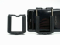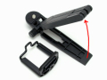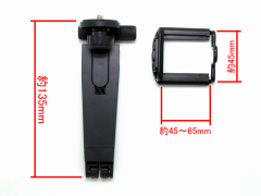 スマートフォン固定用アダプタは、スポンジ素材と軟質ビニル皮膜に覆われた部分にスマートフォンを挟んで固定します。アダプタの幅は、約45mm~65mm。