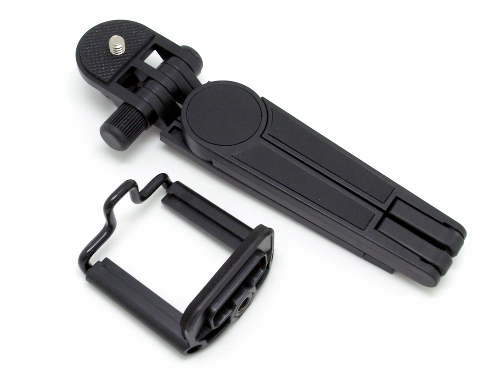 動画撮影や記念撮影に便利な三脚機能と、タブレットのスタンド機能を持つマルチツール。三脚への取り付け用アダプタは、幅45~65mmに変化するので、多くのスマートフォンに対応。