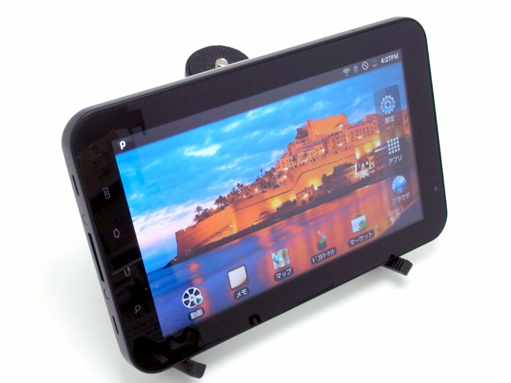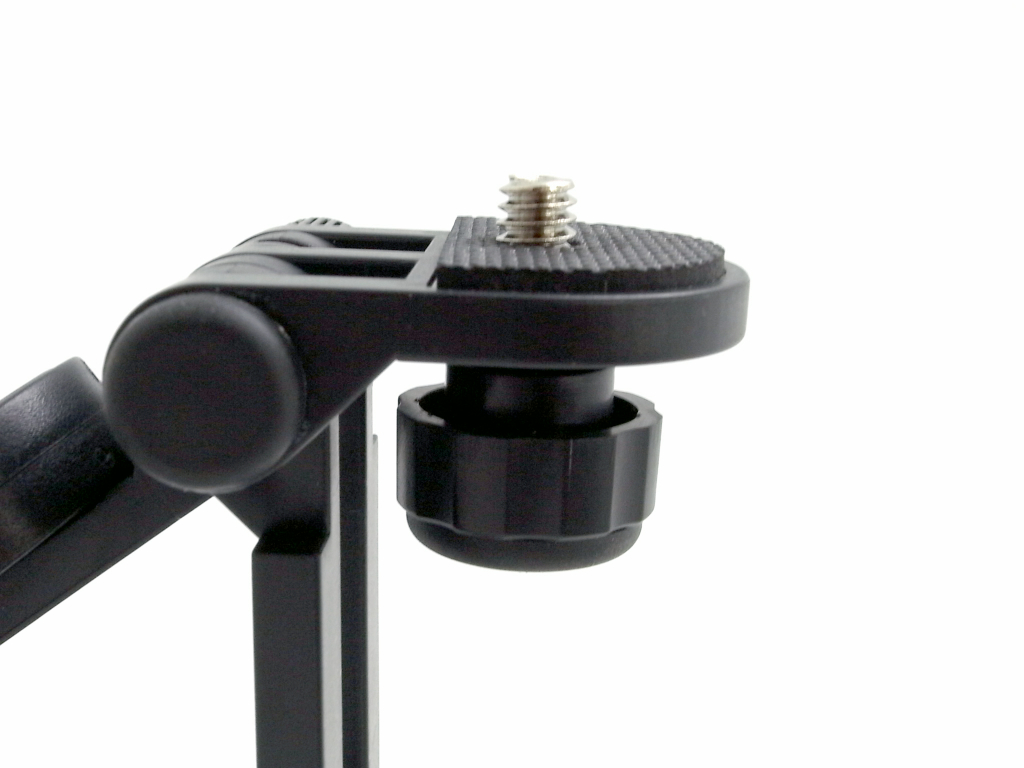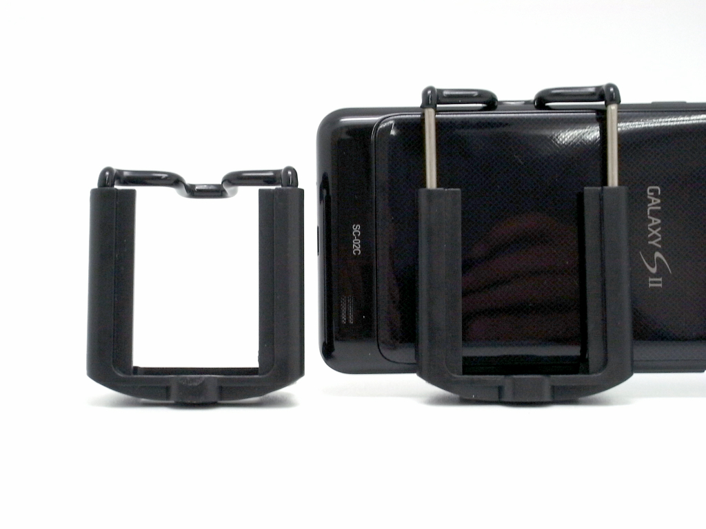 固定用ネジは、1/4インチネジを採用し、ネジ穴のあるデジカメなども固定可能。アダプタにGalaxy S II を固定すると、こんな感じで撮影ができる。