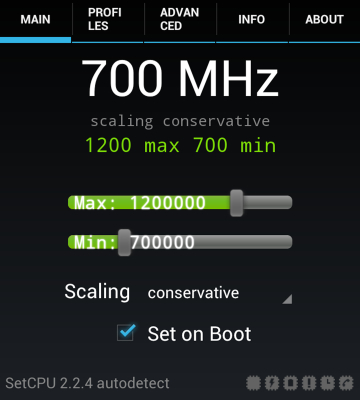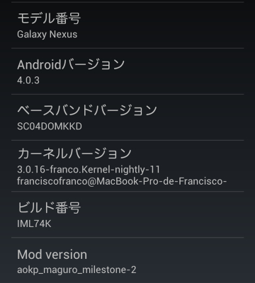 使用した Galaxy NEXUSには、カスタムROMのAOKP maguro Milestone 2と カスタムkernelのfranco.Kernel nightly #11を適用して、SetCPUで 1200max – 700min にセットしていました。