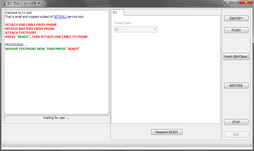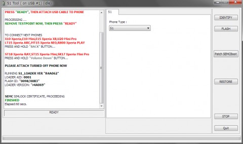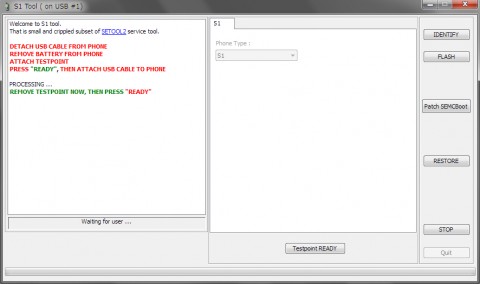 s1toolを起動して、右側の「Patch SEMCBoot」ボタンをクリックすると、下に「Testpoint READY」ボタンが表示されるので、これをクリックします。