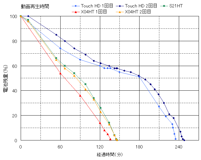 Touch HD、X04HT、S21HT の動画連続再生時間