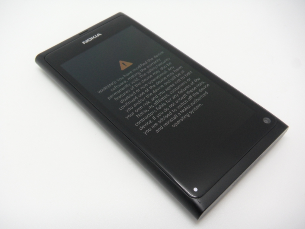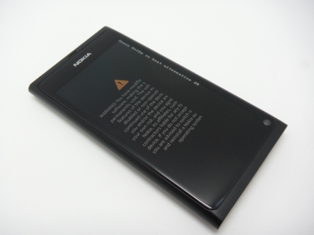 再起動してみると、例の警告が表示され、Press Vol UP key …という表示一瞬が出ますが、音量ダウンボタンや放置しておけばMeeGoが起動できることを確かめておきましょう。