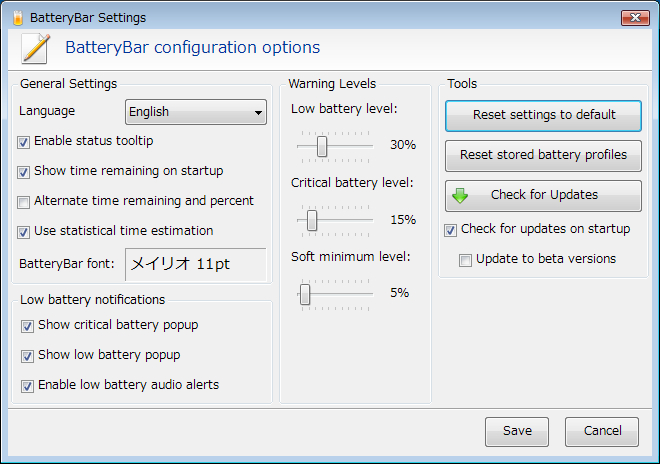 BatteryBarは、バッテリ残量によって、色が変化します。デフォルトでは、100~30%が緑、30~15%が黄、15%以下で赤、充電中が青となってます。また、BatteryBarをクリックごとに、残り残量(%)と残り時間が交互に表示されます。