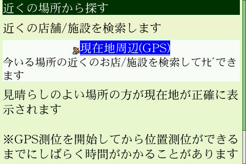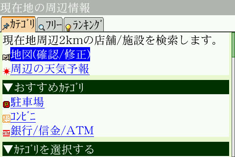 起動直後はこんな感じ。見なれた画面ですね。まずは周辺検索から。BoldのGPSは感度が良いのか悪いのか、確実に空が見える場所じゃないと衛星からのシグナルを補足してくれません。
