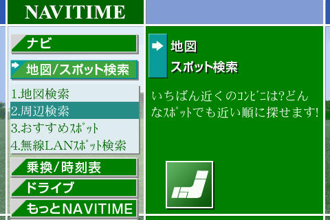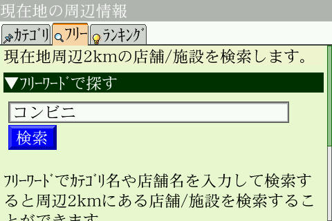現在地が確認できましたので、一つ右のタブからキーワードを入力。とりあえずはコンビニでも…。