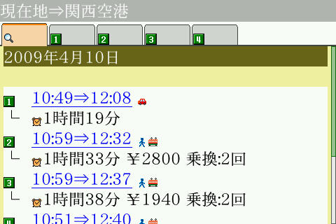 つづいてNAVIです。関空までも検索すると、4通りの結果が表示されました。TAB毎に結果が分かれているのは良いですが、タブには数字のみで何も書かれていないのが気になります。ま、タブの移動はキーボードショートカットが可能ですが、トラックボールでもOKで、サクサクと閲覧できます。ところが、トラックボールで左に動かしていくと検索条件画面に戻ってしまい、再度検索する羽目に。