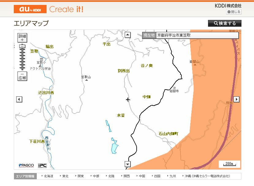 ちなみに、各キャリアのサービスエリアマップを見てみました。右からFOMA、au、イーモバです。実際写真を撮影したポイントはFOMAエリアを微妙に外れていますが、なんとか受信できていたようですね。auもエリアからは外れていますが、アンテナは1本立っていました。