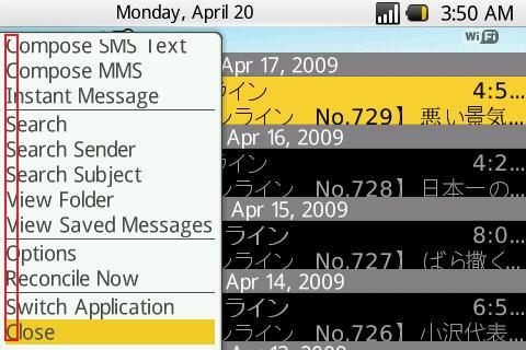 テーマの作りこみにもよると思いますが、キーボードで操作できる範囲が倍増(もっとか)するのは、かなーりグッドですね、もうやめられませんね。例えば下のキャプチャーの赤枠を見ていただければわかりますが、メーラーを閉じる場合、トラックボールを下の方にくるくるくるくる回さなくても「C(Close)」や「E(Exit)」キーで素早く操作できちゃいますね。目から鱗です。アプリケーションだけではなく、例えばオプションでずらーと出てくる各項目もキーボードだけですばやく選択できるようになります。アイコンもサクッと選択できちゃいますね。