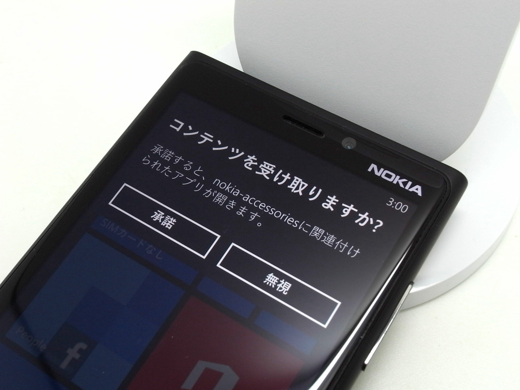 ちなみに、Lumia920を台座にかざす場合、ピタッと触れなくても、このくらいの距離まで近づけるとNFCの反応があり、「コンテンツを受け取るかどうか」の質問が表示されます。