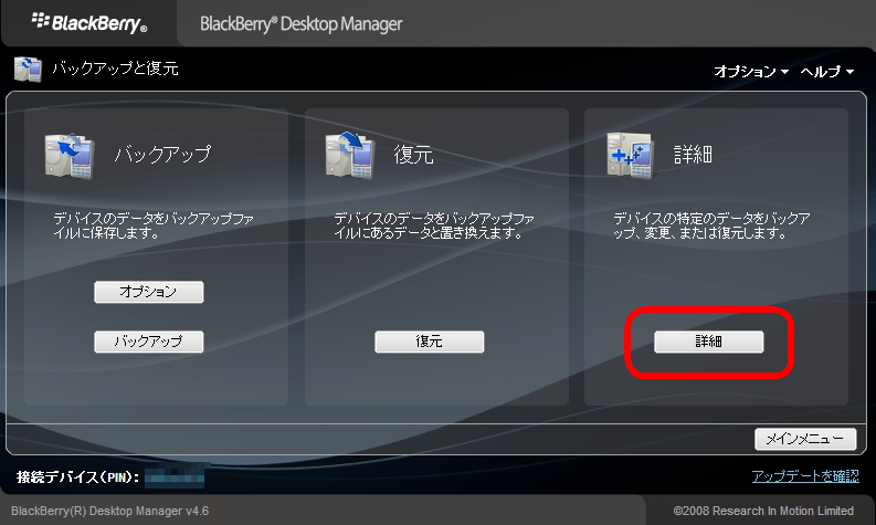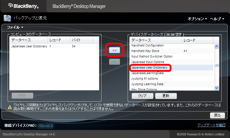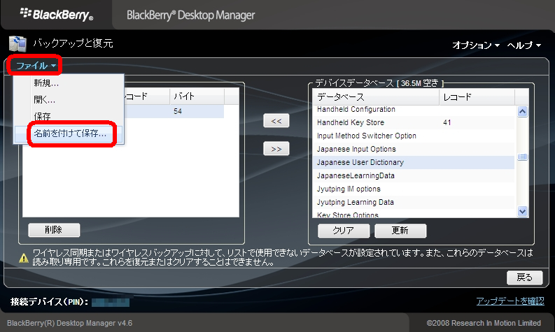 バックアップの方法は、BBBとPCを接続して、PCのBlackBerry Desktop Managerを起動。メインメニューの「バックアップと復元」>「詳細」を選択。デバイスデータベース側の「Japanese User Dictionary」を選択して「< <」をクリック。すると「コンピュータのデータベース」に表示されるので、これを「ファイル」>「名前を付けて保存」します。