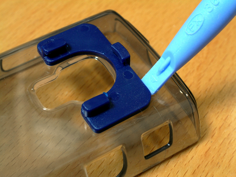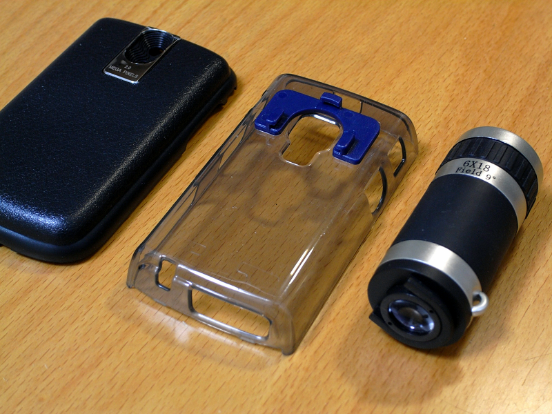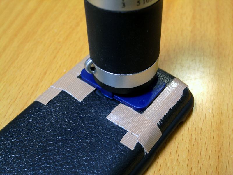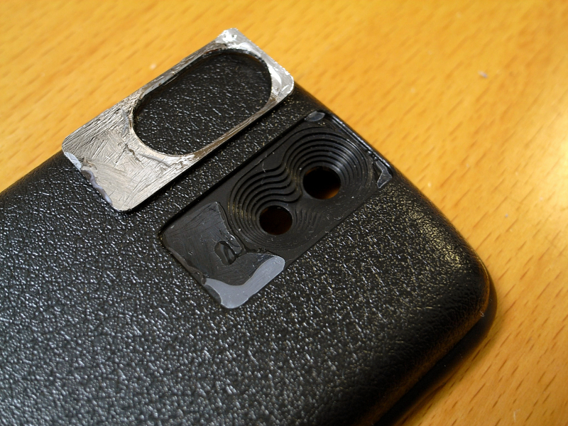 次に、大容量バッテリカバーのシルバーのパーツを取り除く。材料が揃ったら、両面テープでバッテリカバーとレンズ土台を仮組みして、BBBのカメラを起動。レンズ位置を決定したら、土台の位置に印を付け、両面テープを剥がし、あらためて瞬間接着剤などで固定して出来上がり。