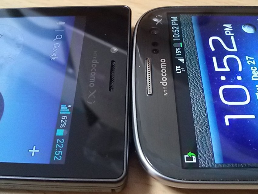 ちょっと話は変わりますが、トップの画像はGalaxy S IIIαとOptimus G L-01Eです。同じdocomoですが、Galaxy はLTEに繋がりOptimus Gは3Gですね。各社のチューニングによるものか、感度の差なのか不明ですが、中途半端にLTEに繋がるよりは、消費電力が少ない(と言われる)3Gで安定して繋いでくれたほうが良いかもしれませんね。