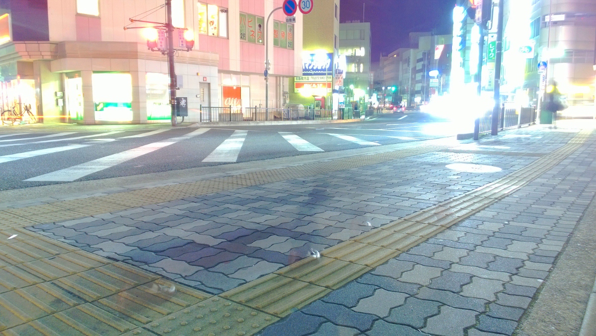 5月というのに、寒すぎる枚方駅付近のスクランブル交差点にやって来ました。人通りが少なく照明も少ないのですが、シャッタースピードを2秒で撮るとこんなに明るい大都会になります。手前に薄い影がありますが、目の前を人が横切ったからです。残念ながらEVが-2までしか設定できず、ヘッドライトが入ってしまうと真っ白な画像になってしまいます。