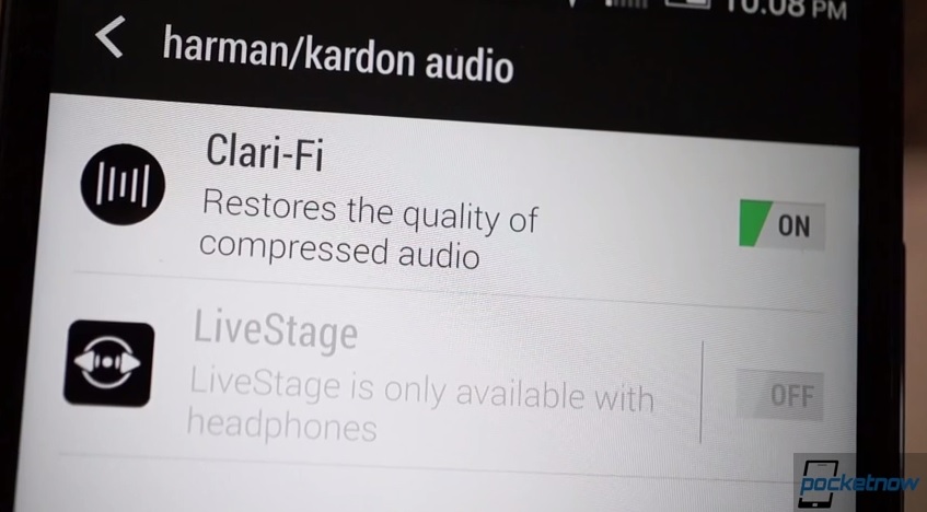 M8にはない、Clari-FiとLiveStageという項目が増えています(画像はPocketNowより)。Clari-FiはMP3など、圧縮されて消えてしまったデータを補完するという技術。LiveStageは恐らく臨場感あふれるエフェクトを掛け、Harman/Kardonのイヤホンに最適化するってことでしょうかね。